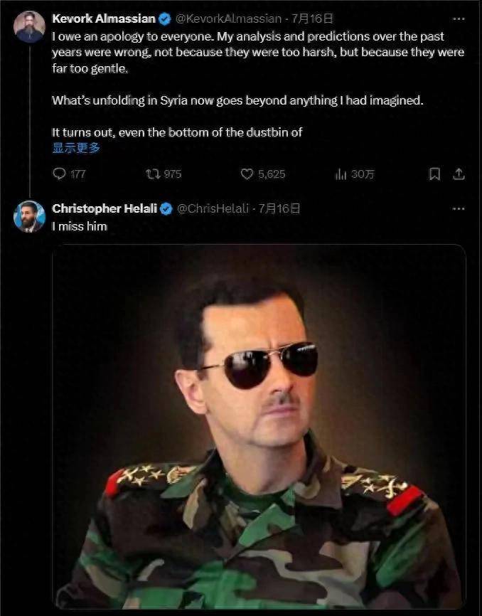 就在以色列轰炸叙利亚首都之后,一位著名的中东地缘政治分析师发文认错道歉,他说过去几年的分析和预测都是错的,叙利亚发生的事情已经超出想象,事实证明即使是历史垃圾堆的最底下也是没有底线的。所谓的“暴君”阿萨德,只有在他离开后,一切都会更明显。没有他撑这么些年,叙利亚早就成了炼狱。
